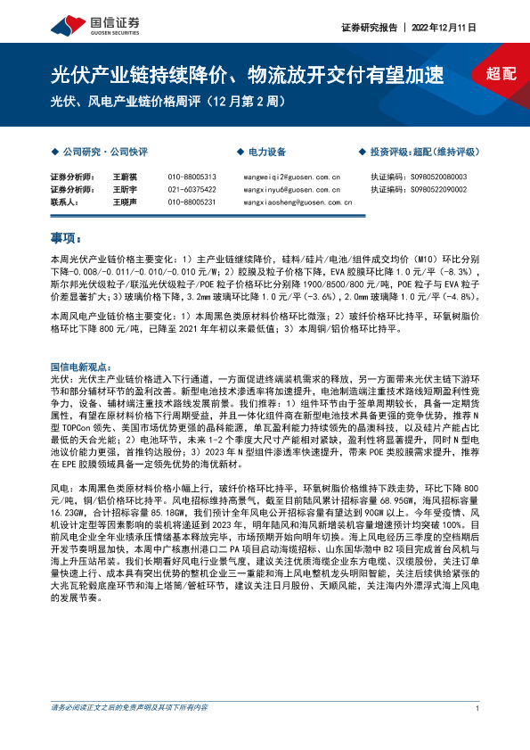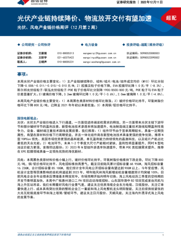【国信证券】【20221211】光伏、风电产业链价格周评(12月第2周):光伏产业链持续降价、物流放开交付有望加速-13页