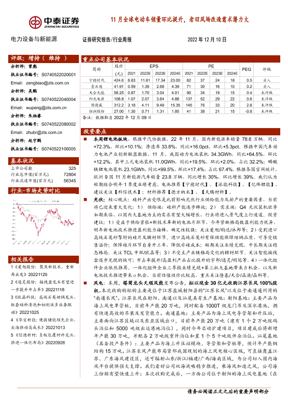 新能源行业 电力设备 电动车销量 老旧风场改造 锂电池
