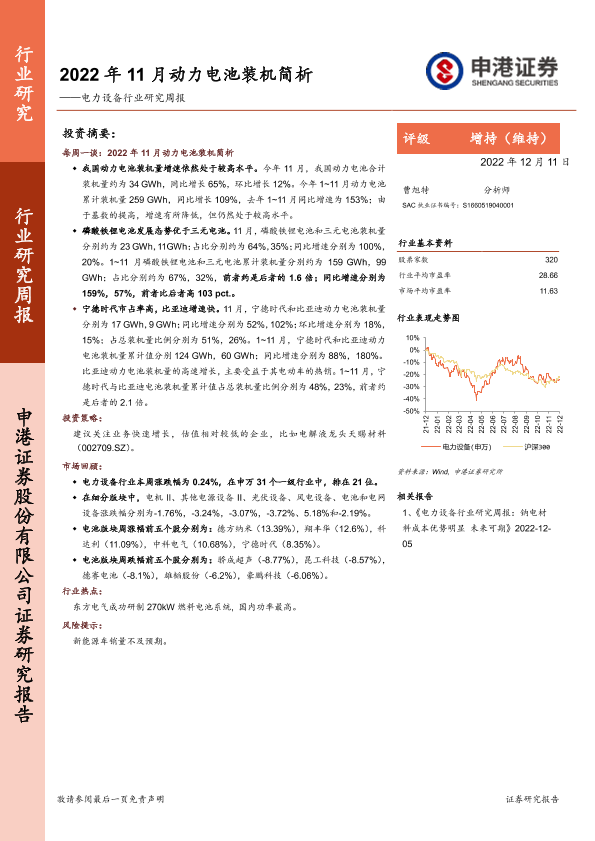 【申港证券】【20221211】2022年11月动力电池装机简析——电力设备行业研究周报-10页