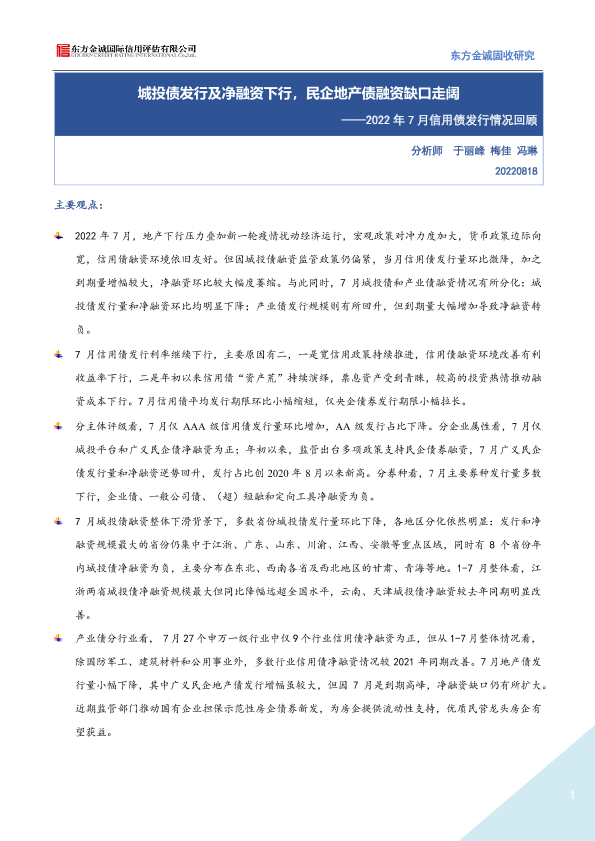 【东方金诚】【20220818】2022年7月信用债发行情况回顾:城投债发行及净融资下行,民企地产债融资缺口走阔-15页