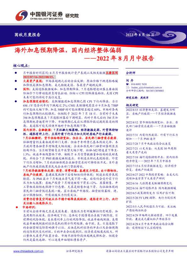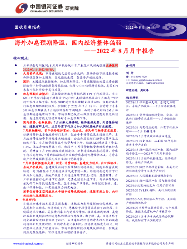 【银河证券】【20220816】2022年8月月中报告:海外加息预期降温,国内经济整体偏弱-24页