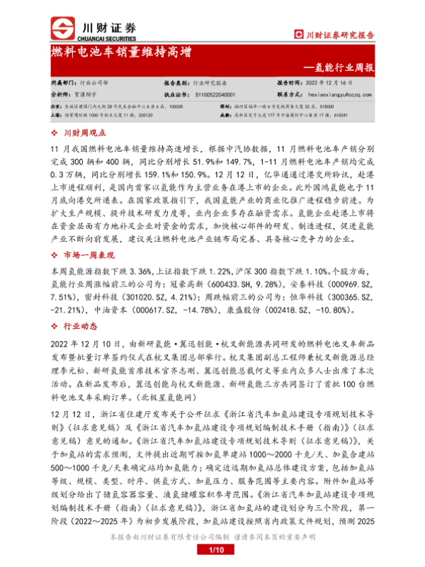 【川财证券】【20221216】20221216-川财证券-氢能行业周报:燃料电池车销量维持高增-10页