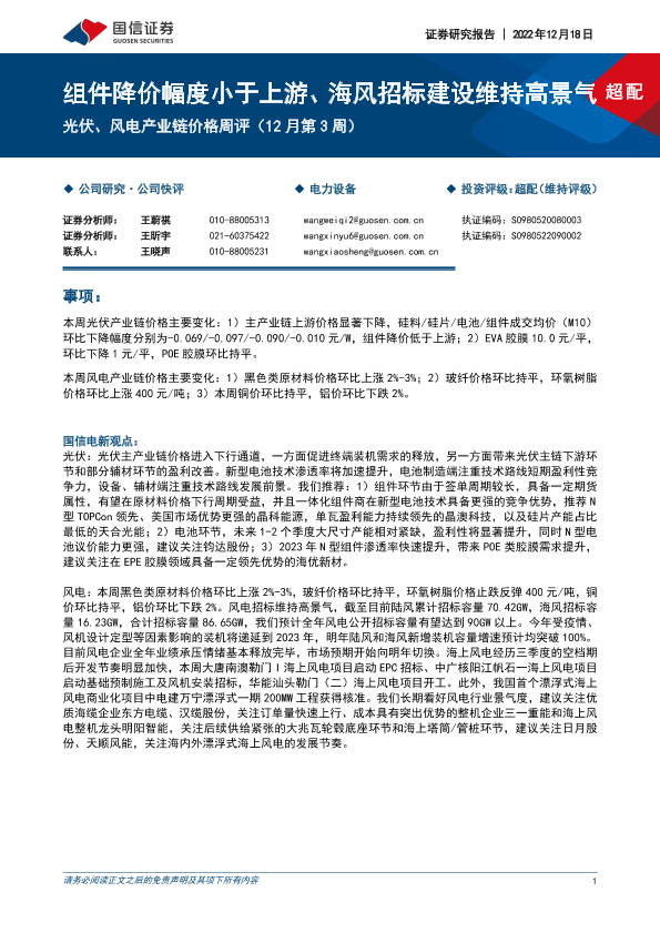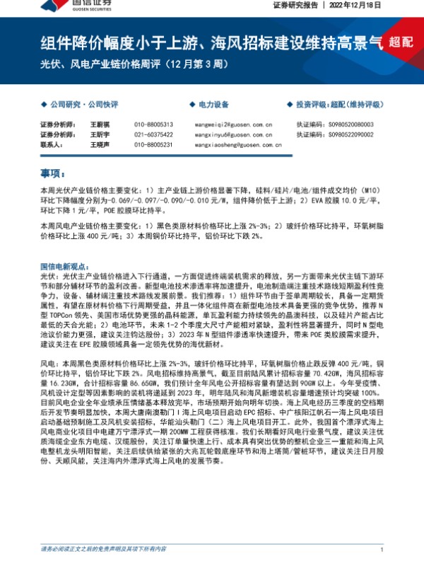 【国信证券】【20221218】光伏、风电产业链价格周评(12月第3周):组件降价幅度小于上游、海风招标建设维持高景气-13页