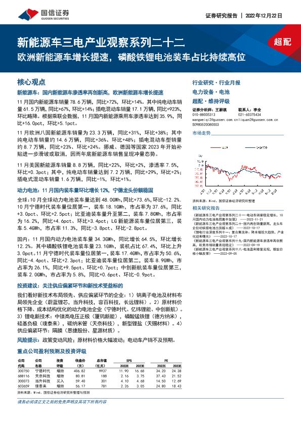 【国信证券】【20221222】20221222-国信证券-新能源车三电产业观察系列二十二:欧洲新能源车增长提速,磷酸铁锂电池装车占比持续高位-13页