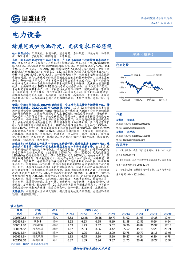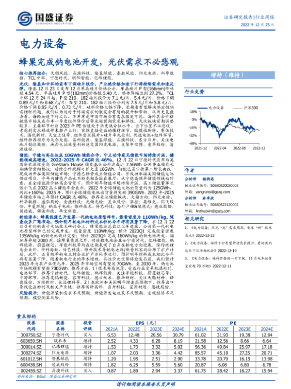【国盛证券】【20221225】电力设备行业周报:蜂巢完成钠电池开发,光伏需求不必悲观-12页