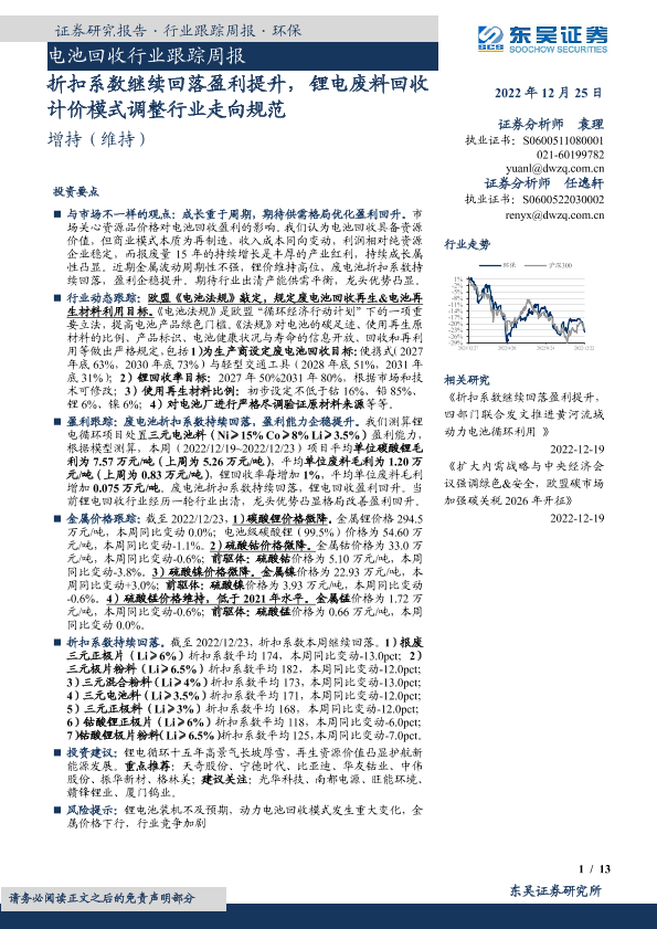【东吴证券】【20221225】电池回收行业跟踪周报:折扣系数继续回落盈利提升,锂电废料回收计价模式调整行业走向规范-13页