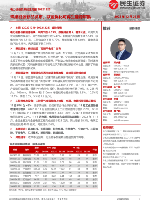 【民生证券】【20221225】电力设备及新能源周报:蜂巢能源新品发布,欧盟优化可再生能源审批-29页