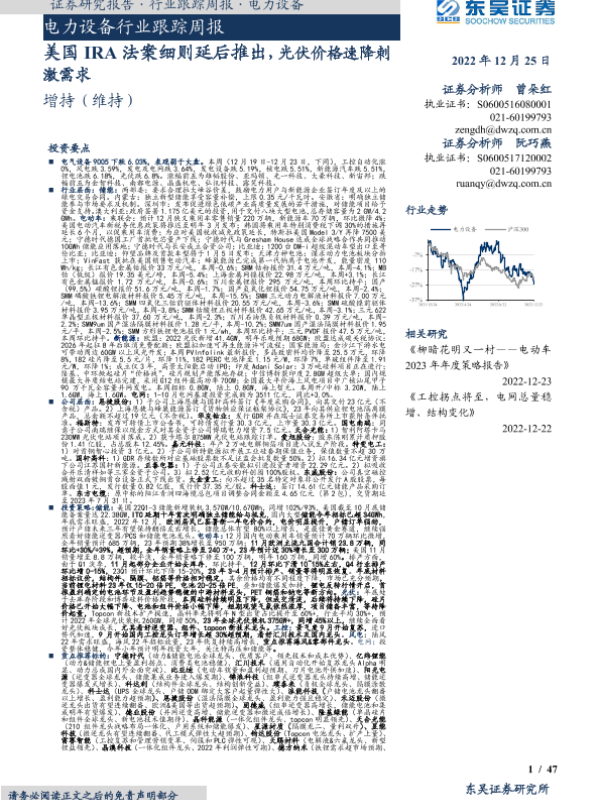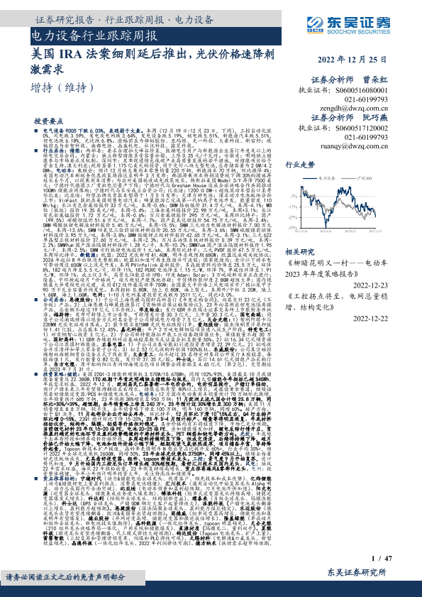 【东吴证券】【20221225】电力设备行业跟踪周报:美国IRA法案细则延后推出,光伏价格速降刺激需求-47页