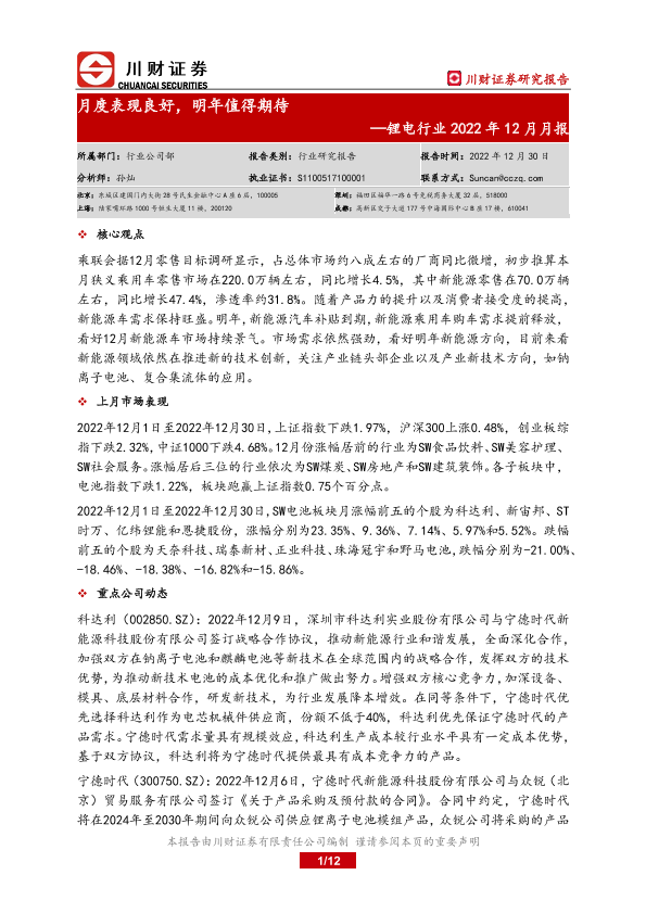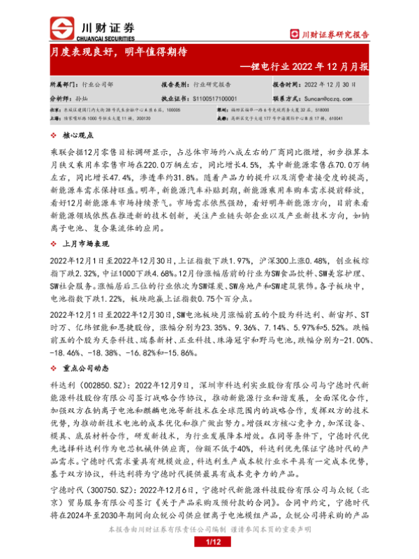 【川财证券】【20221230】锂电行业2022年12月月报:月度表现良好,明年值得期待-12页
