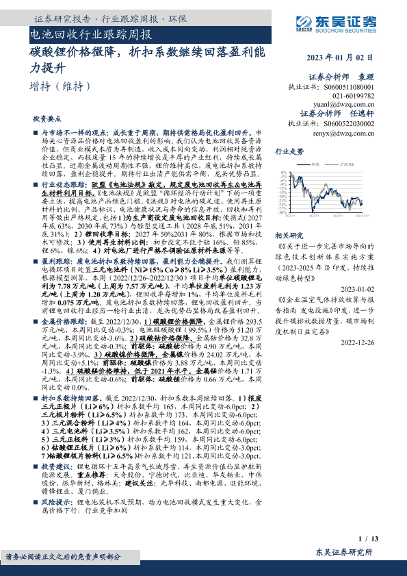 【东吴证券】【20230102】电池回收行业跟踪周报:碳酸锂价格微降,折扣系数继续回落盈利能力提升-13页