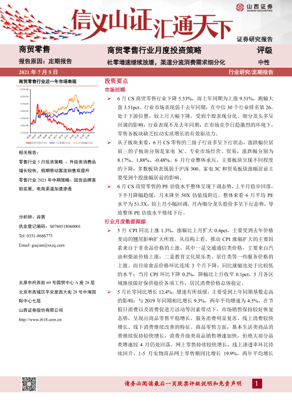【山西证券】【20210705】商贸零售行业月度投资策略:社零增速继续放缓,渠道分流消费需求细分化-16页