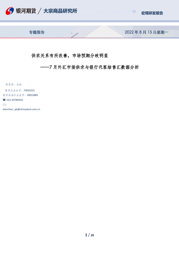 【银河期货】【20220815】7月外汇市场供求与银行代客结售汇数据分析:供求关系有所改善,市场预期分歧明显-20页