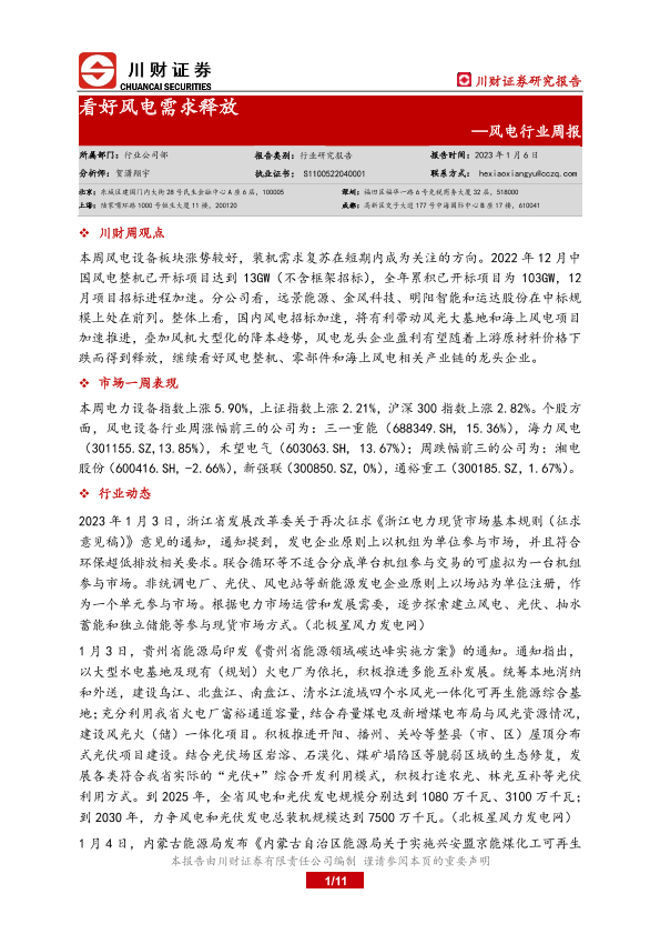 【川财证券】【20230106】20230106-川财证券-风电行业周报:看好风电需求释放-11页