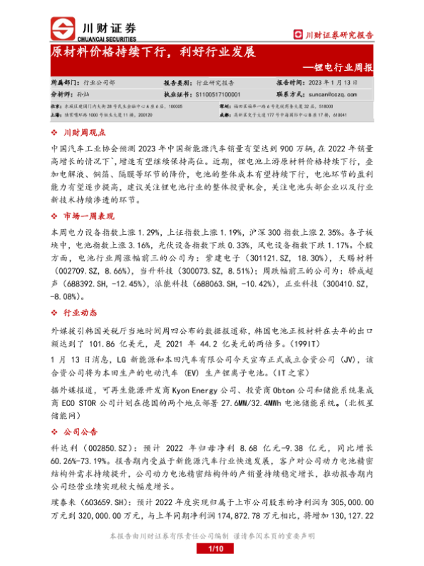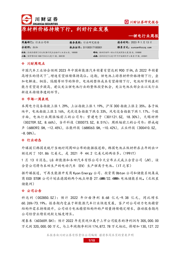 【川财证券】【20230113】20230113-川财证券-锂电行业周报:原材料价格持续下行,利好行业发展-10页