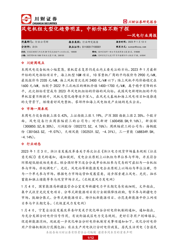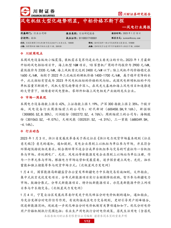 【川财证券】【20230113】风电行业周报:风电机组大型化趋势明显,中标价格不断下探-12页