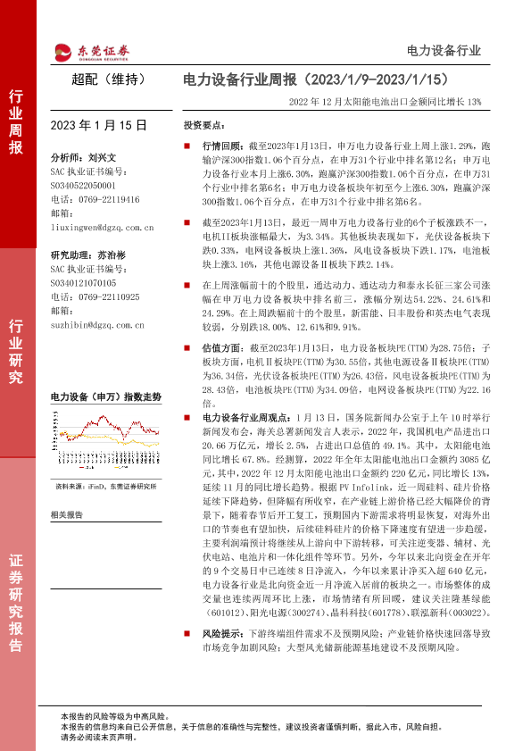 【东莞证券】【20230115】20230115-东莞证券-电力设备行业周报:2022年12月太阳能电池出口金额同比增长13%-13页