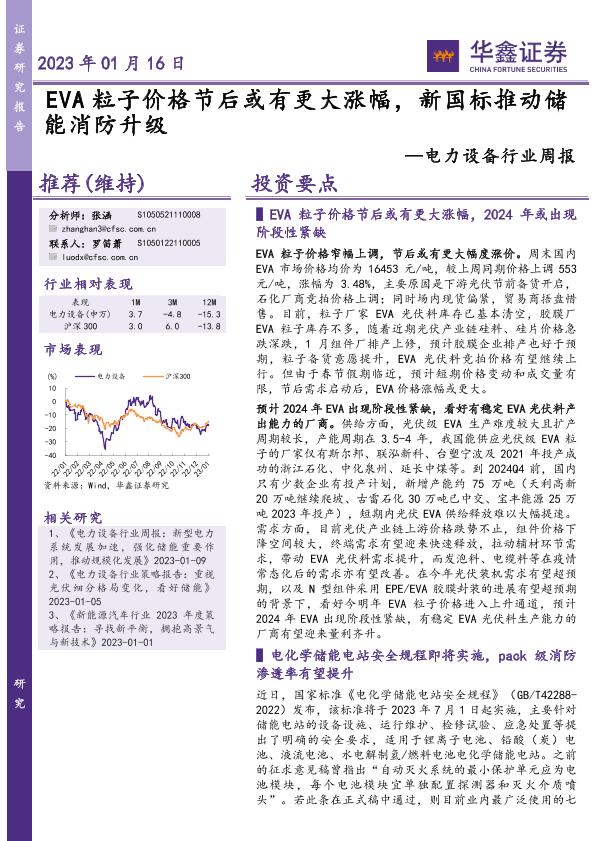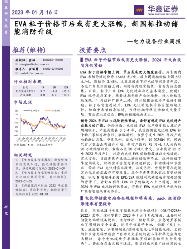 【华鑫证券】【20230116】电力设备行业周报:EVA粒子价格节后或有更大涨幅,新国标推动储能消防升级-12页