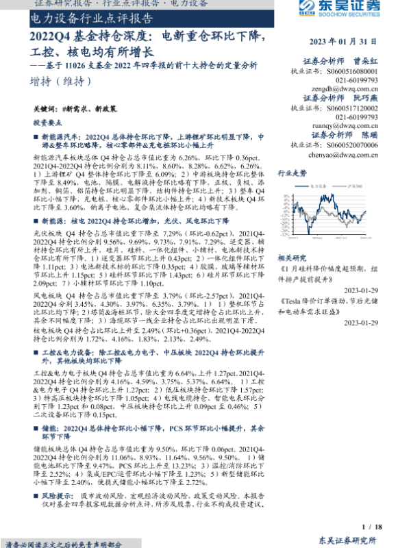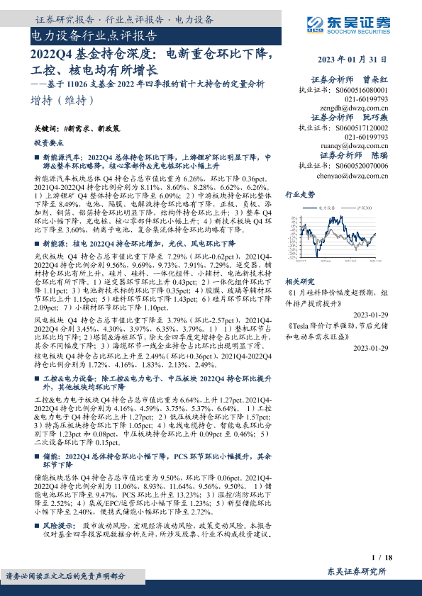 【东吴证券】【20230131】券-电力设备行业点评报告:2022Q4基金持仓深度:电新重仓环比下降,工控、核电均有所增长-18页