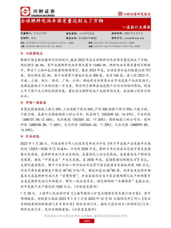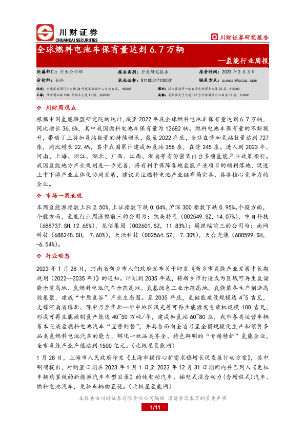 【川财证券】【20230203】20230203-川财证券-氢能行业周报:全球燃料电池车保有量达到6.7万辆-11页