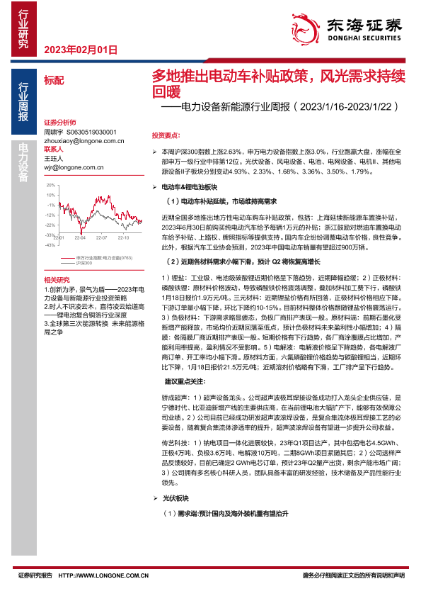 【东海证券】【20230201】20230201-东海证券-电力设备新能源行业周报:多地推出电动车补贴政策,风光需求持续回暖-34页