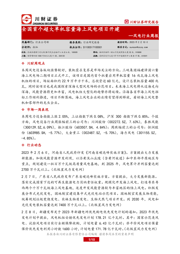【川财证券】【20230210】20230210-川财证券-风电行业周报:全国首个超大单机容量海上风电项目开建-10页