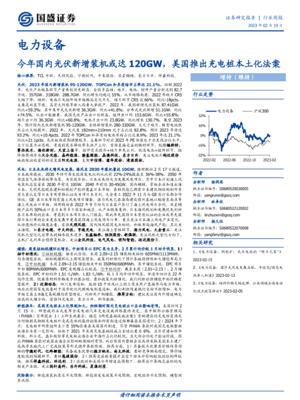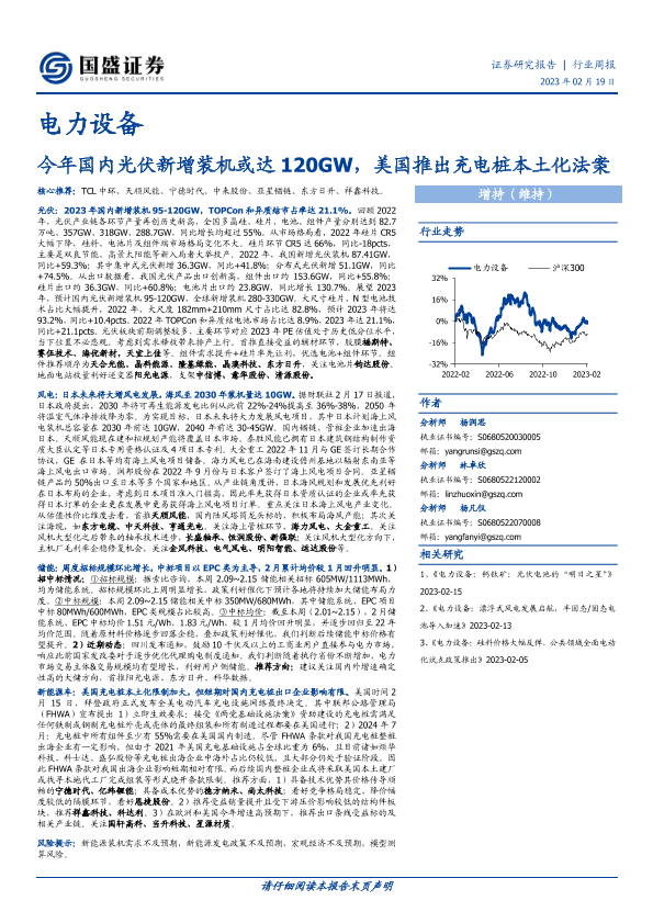 【国盛证券】【20230219】20230219-国盛证券-电力设备行业周报:今年国内光伏新增装机或达120GW,美国推出充电桩本土化法案-20页