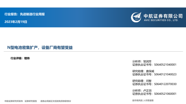 【中航证券】【20230219】20230219-中航证券-先进制造行业周报:N型电池密集扩产,设备厂商有望受益-12页