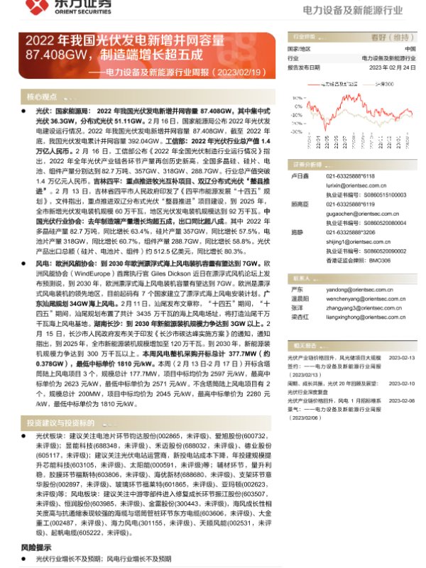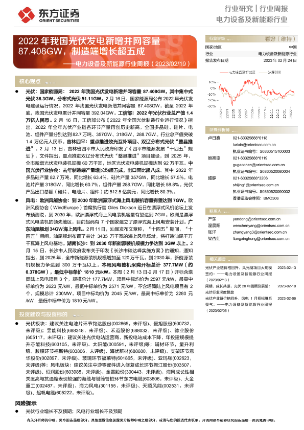 【东方证券】【20230224】20230224-东方证券-电力设备及新能源行业周报:2022年我国光伏发电新增并网容量87.408GW,制造端增长超五成-12页