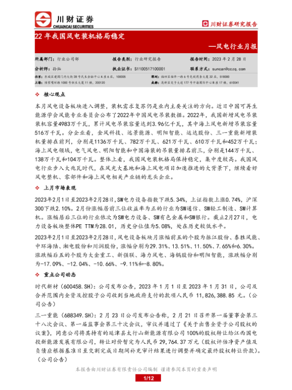 【川财证券】【20230228】20230228-川财证券-风电行业月报:22年我国风电装机格局稳定-12页