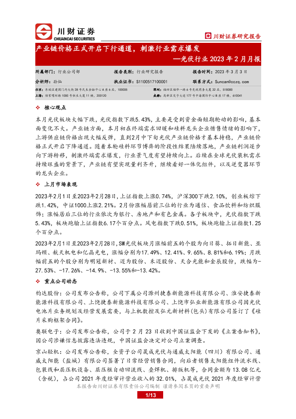 【川财证券】【20230303】光伏行业2023年2月月报:产业链价格正式开启下行通道,刺激行业需求爆发-13页