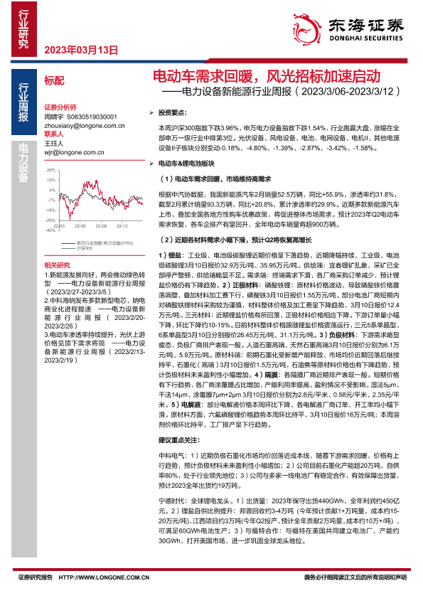 【东海证券】【20230313】20230313-东海证券-电力设备新能源行业周报:电动车需求回暖,风光招标加速启动-34页