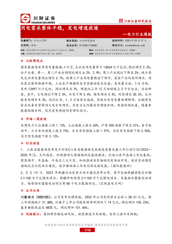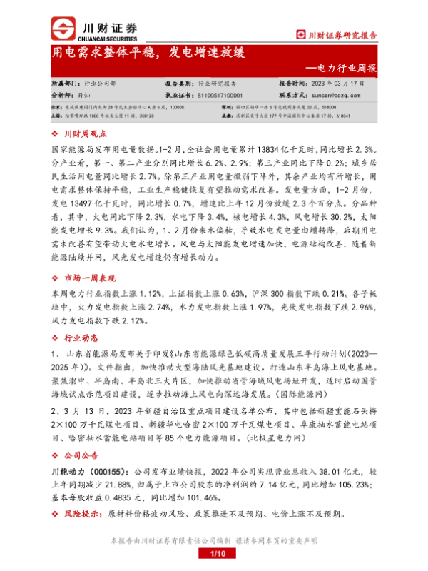 【川财证券】【20230317】20230317-川财证券-电力行业周报:用电需求整体平稳,发电增速放缓-10页