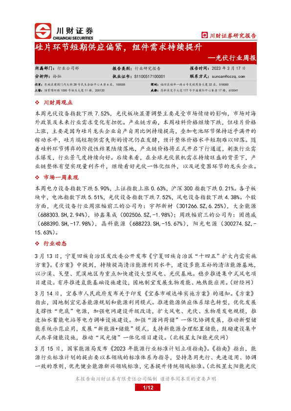 【川财证券】【20230317】20230317-川财证券-光伏行业周报:硅片环节短期供应偏紧,组件需求持续提升-12页