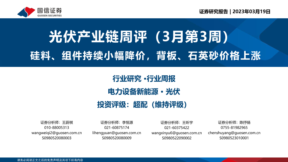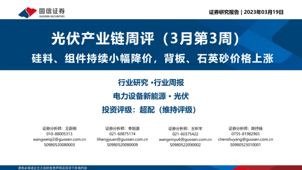 【国信证券】【20230319】光伏产业链周评(3月第3周):硅料、组件持续小幅降价,背板、石英砂价格上涨-14页