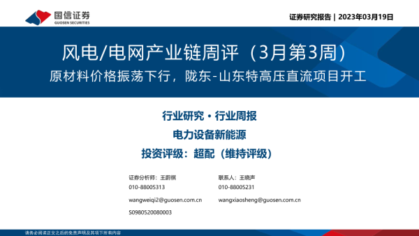 【国信证券】【20230319】风电/电网产业链周评(3月第3周):原材料价格振荡下行,陇东-山东特高压直流项目开工-23页