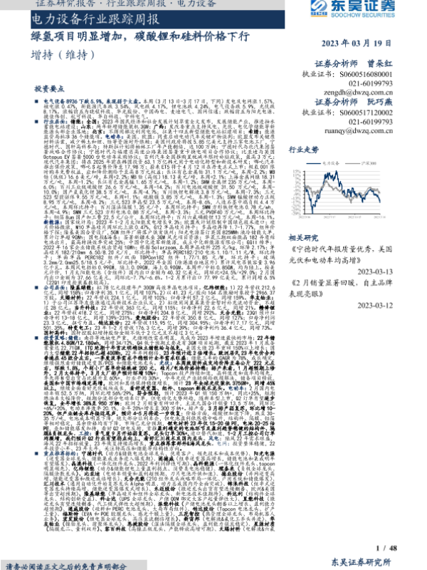 【东吴证券】【20230319】20230319-东吴证券-电力设备行业跟踪周报:绿氢项目明显增加,碳酸锂和硅料价格下行-48页