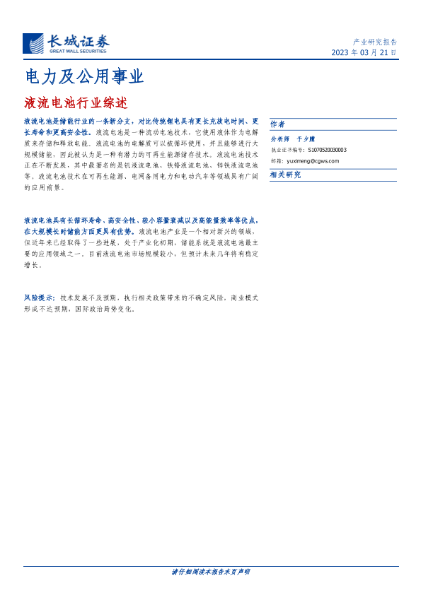 【长城证券】【20230321】电力及公用事业:液流电池行业综述-16页