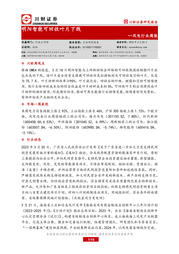 【川财证券】【20230324】20230324-川财证券-风电行业周报:明阳智能可回收叶片下线-10页
