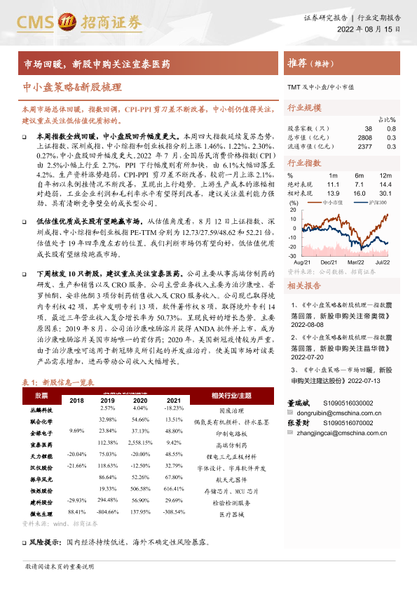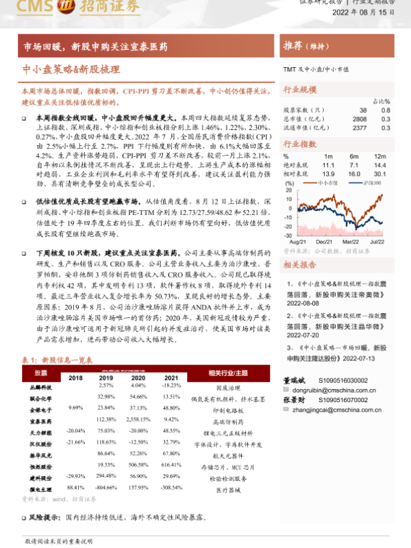 【海通证券】【20220815】中小盘策略&新股梳理:市场回暖,新股申购关注宣泰医药-26页