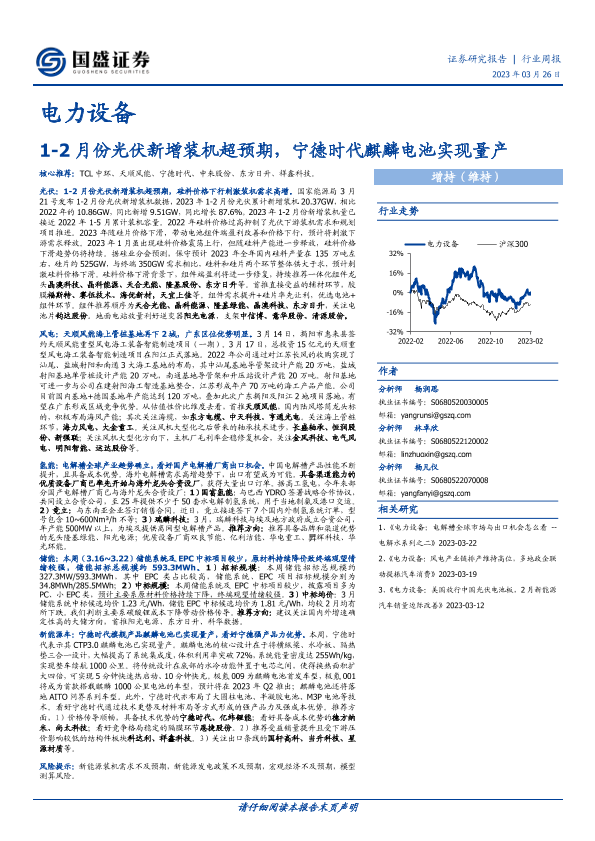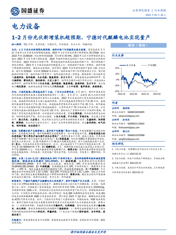 【国盛证券】【20230326】20230326-国盛证券-电力设备行业周报:1-2月份光伏新增装机超预期,宁德时代麒麟电池实现量产-20页