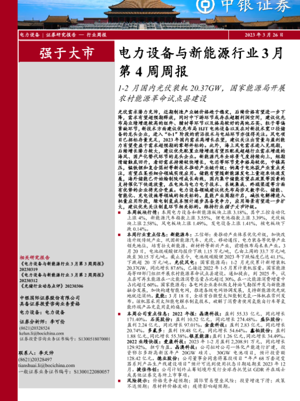 【中银证券】【20230326】电力设备与新能源行业3月第4周周报:1-2月国内光伏装机20.37GW,国家能源局开展农村能源革命试点县建设-19页