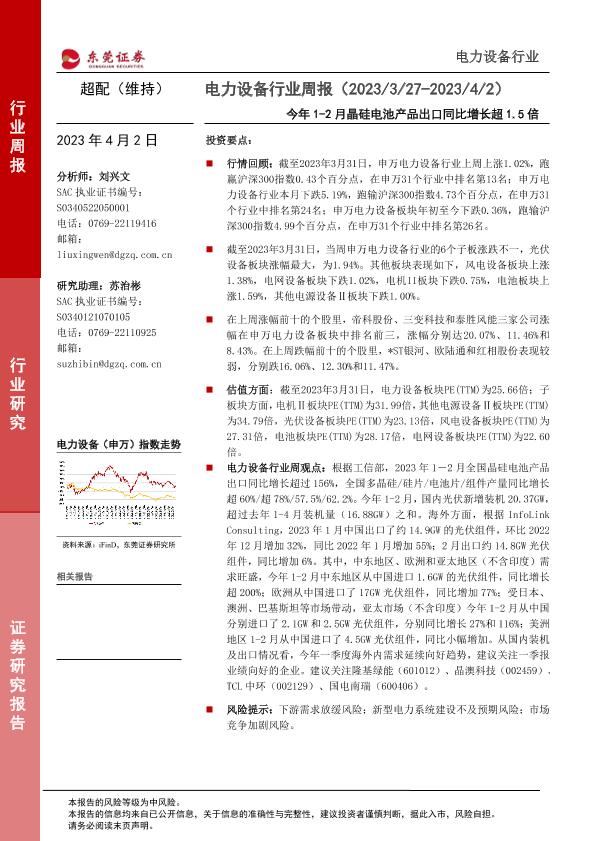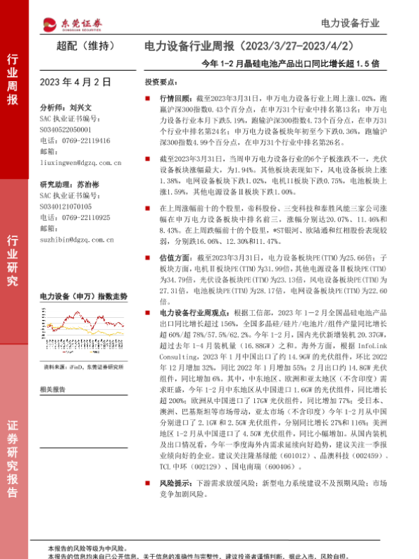 【东莞证券】【20230402】20230402-东莞证券-电力设备行业周报:今年1-2月晶硅电池产品出口同比增长超1.5倍-12页