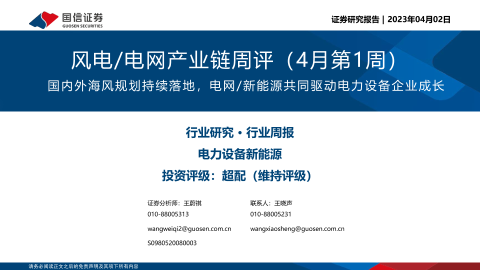 【国信证券】【20230402】风电/电网产业链周评(4月第1周):国内外海风规划持续落地,电网/新能源共同驱动电力设备企业成长-25页
