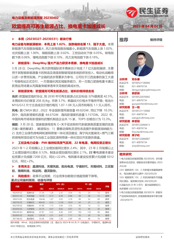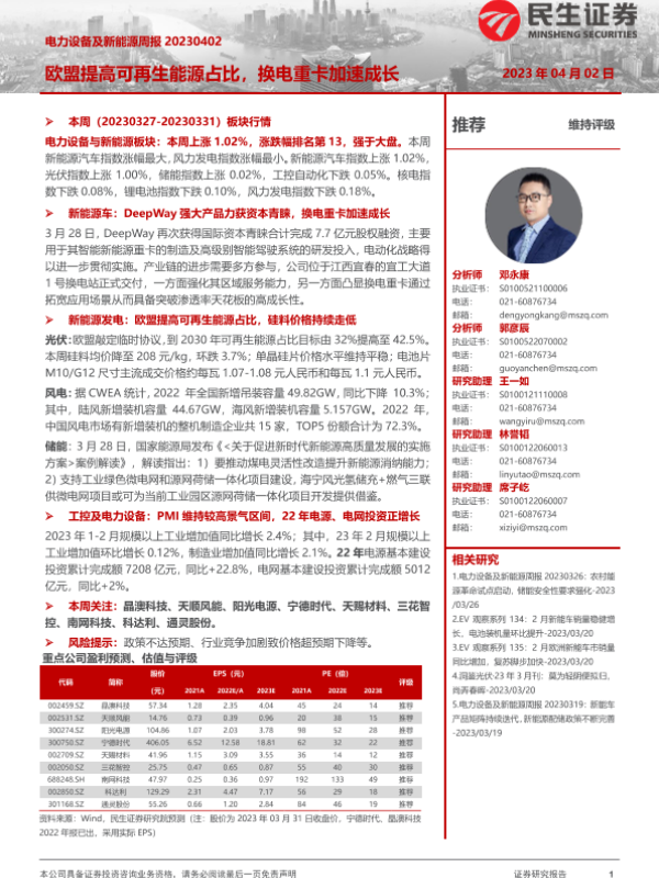 【民生证券】【20230402】电力设备及新能源周报:欧盟提高可再生能源占比,换电重卡加速成长-26页