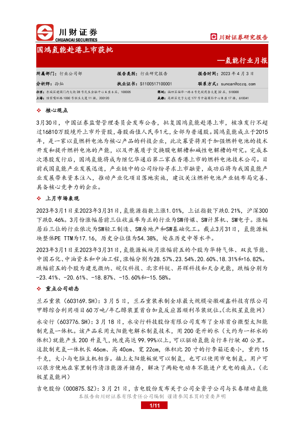 【川财证券】【20230403】20230403-川财证券-氢能行业月报:国鸿氢能赴港上市获批-11页