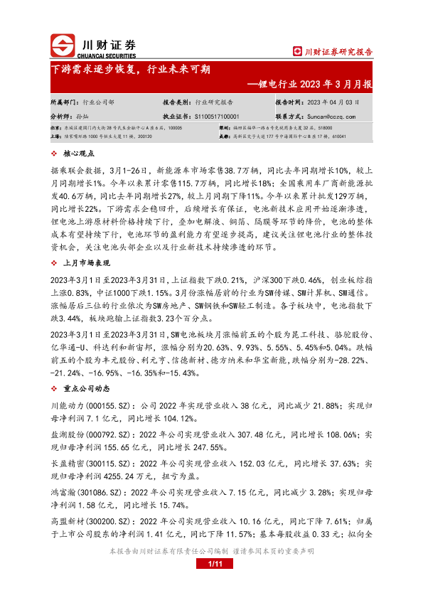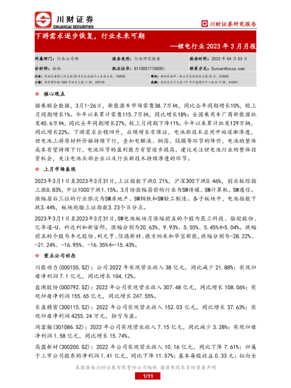 【川财证券】【20230403】锂电行业2023年3月月报:下游需求逐步恢复,行业未来可期-11页