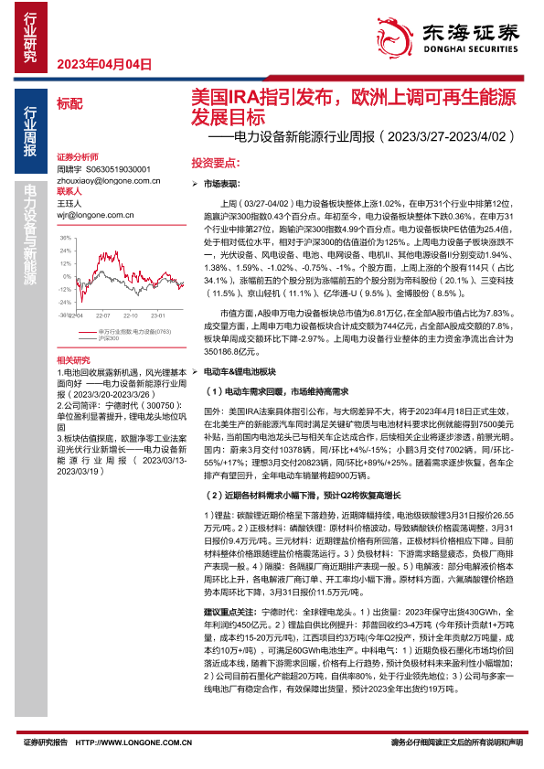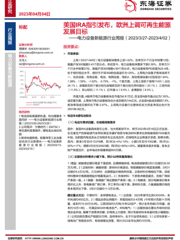 【东海证券】【20230404】20230404-东海证券-电力设备新能源行业周报:美国IRA指引发布,欧洲上调可再生能源发展目标-32页