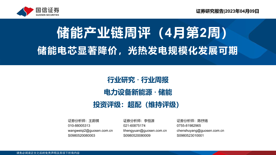 【国信证券】【20230409】20230409-国信证券-储能产业链周评(4月第2周):储能电芯显著降价,光热发电规模化发展可期-30页
