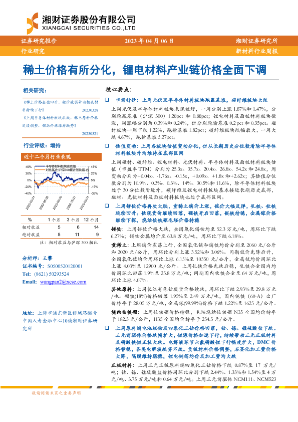 【湘财证券】【20230406】20230406-湘财证券-新材料行业周报:稀土价格有所分化,锂电材料产业链价格全面下调-13页
