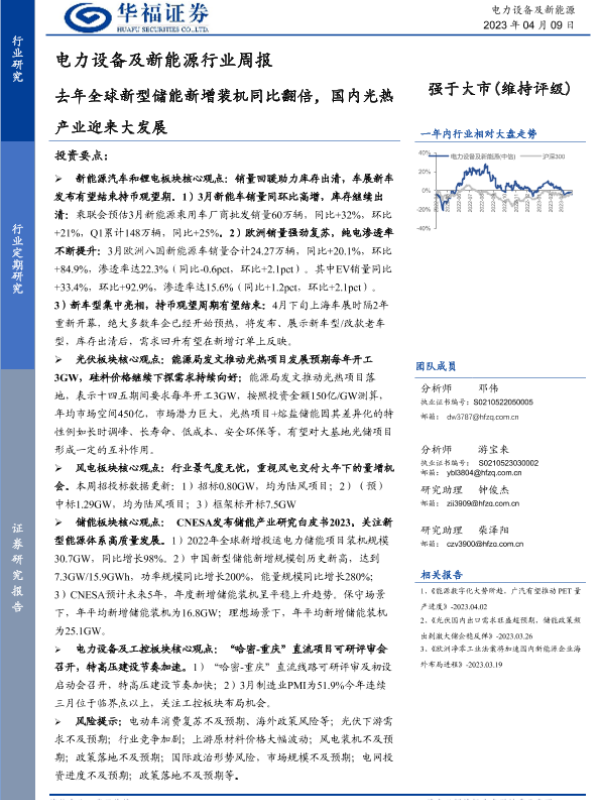 【华福证券】【20230409】电力设备及新能源行业周报:去年全球新型储能新增装机同比翻倍,国内光热产业迎来大发展-11页